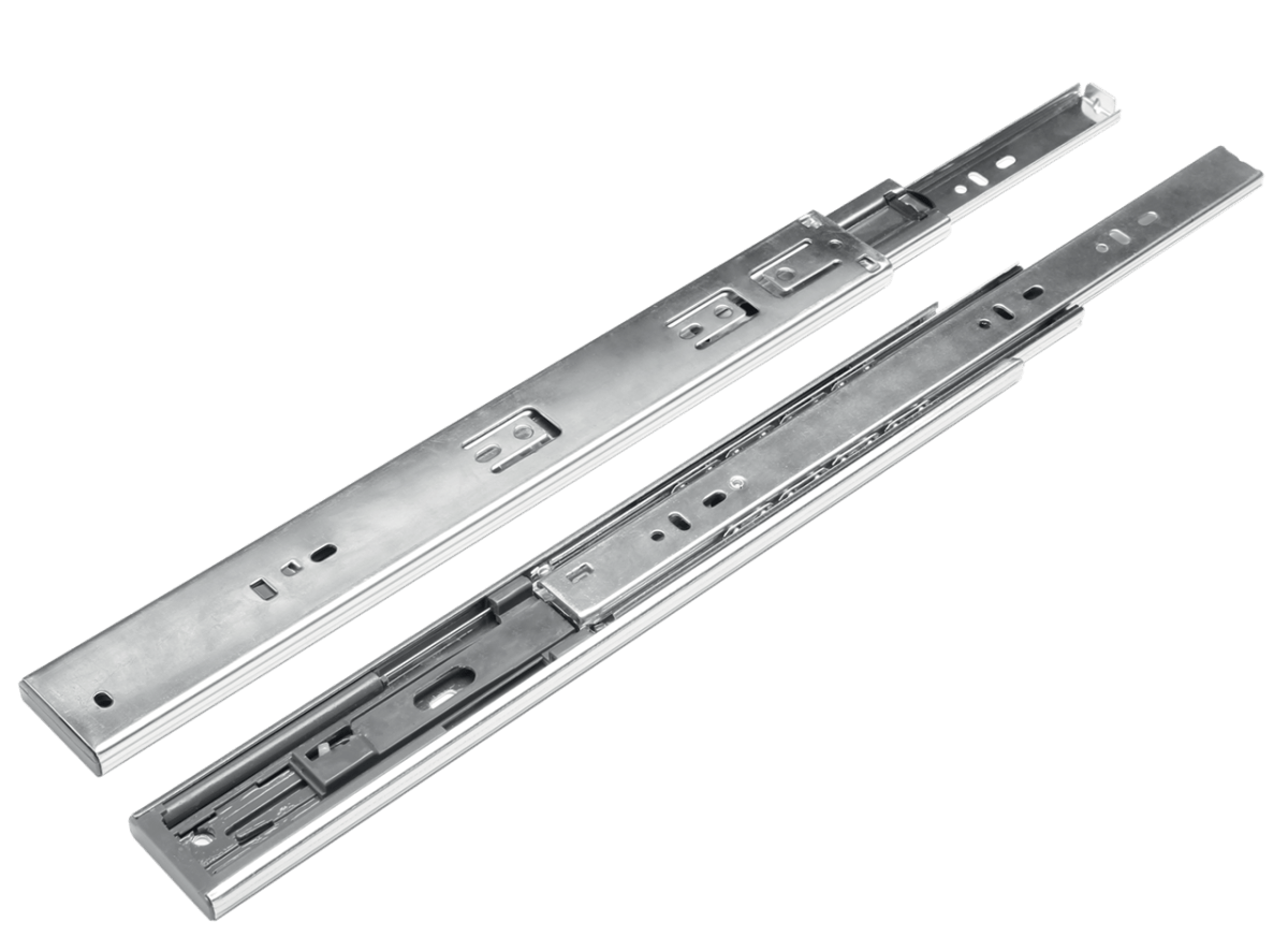 - Направляющие. Нужны для ящиков в тумбах, комодах. От их подбора зависят плавность хода, надежность, долговечность. Самый популярный вид – роликовые направляющие. Они одни из наиболее дешевых, но не выдерживают больших нагрузок. Их можно выбрать для маленьких ящиков под мелочи или легких вещей. Крупные варианты с соответствующей нагрузкой требуют полностью металлического механизма – шарикового. Они дороже, но удобнее в использовании, крепче. Современным вариантом является самовыдвижная система с открыванием путем нажатия. Она позволит удивить друзей, а также избавит от ручек на фасаде.