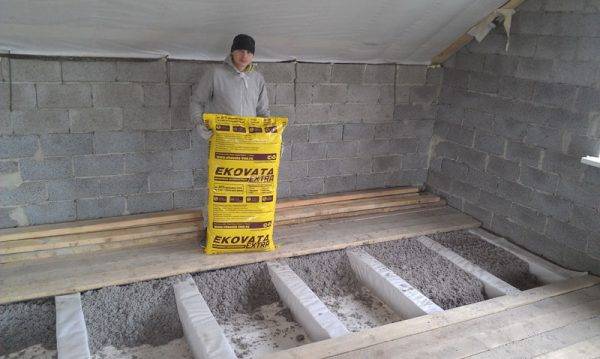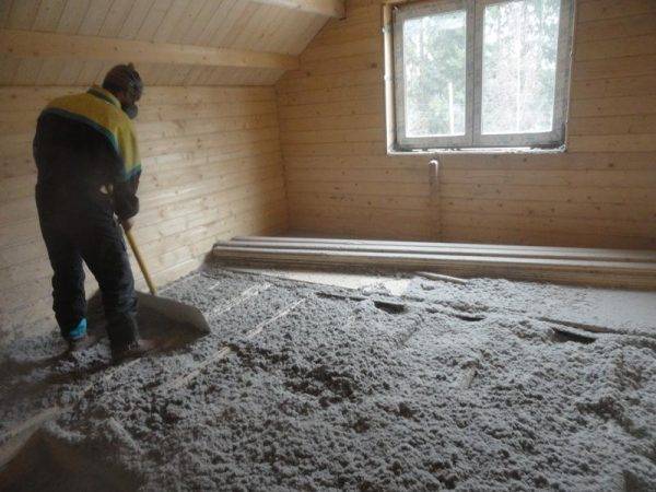 - При засыпке в перекрытия масса должна быть равномерно распределена между лагами и стропилами. Ей заполняют все требуемые места, до образования поверхности с горкой. При последующем использовании половой доски материал уплотнится до необходимого объема.