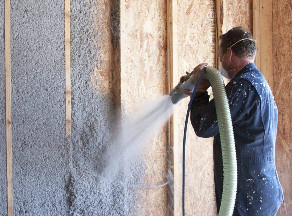 Мокрая укладка целлюлозного утеплителя требует применения специального оборудования, которое смешивает теплоизоляционную массу и воду, а за тем выбрасывает под давлением готовую субстанцию на поверхность стены.