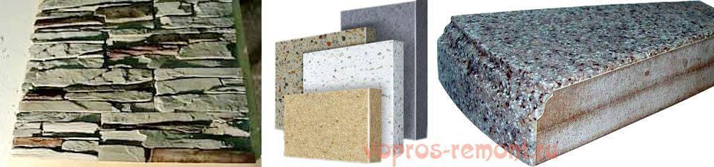 Материал отличается небольшим весом, огнеупорность и доступной ценой. Он изготавливается разного цвета, формы и текстуры. Его долговечность меньше натурального камня.