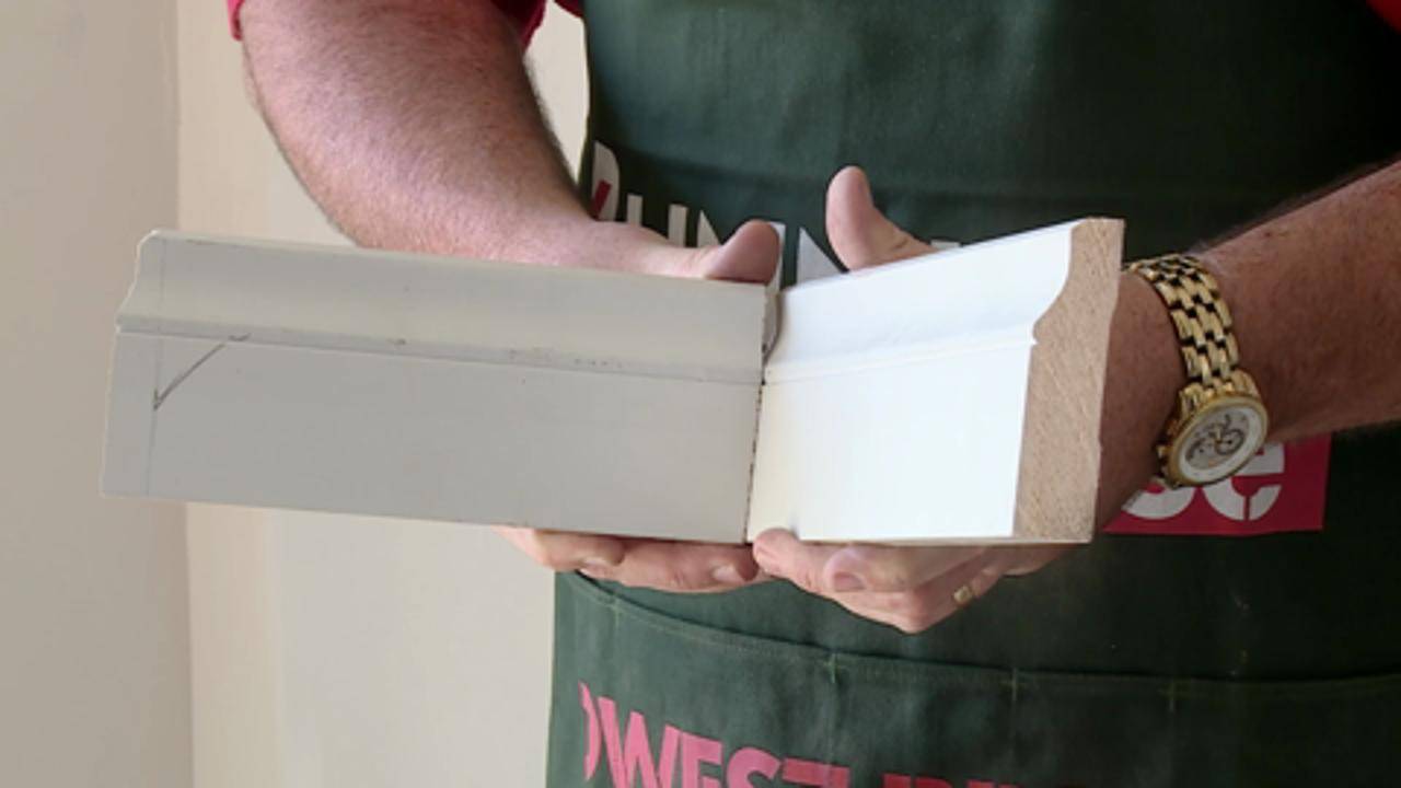 3. Не приклеивайте сразу первую планку запиленного плинтуса. Запилите вторую сторону угла и соедините угол по месту. Между отпиленными краями должен быть минимальный зазор. Если это не так, то ножом подравняйте внутреннюю поверхность спиленного угла. Добейтесь минимального зазора в стыке.