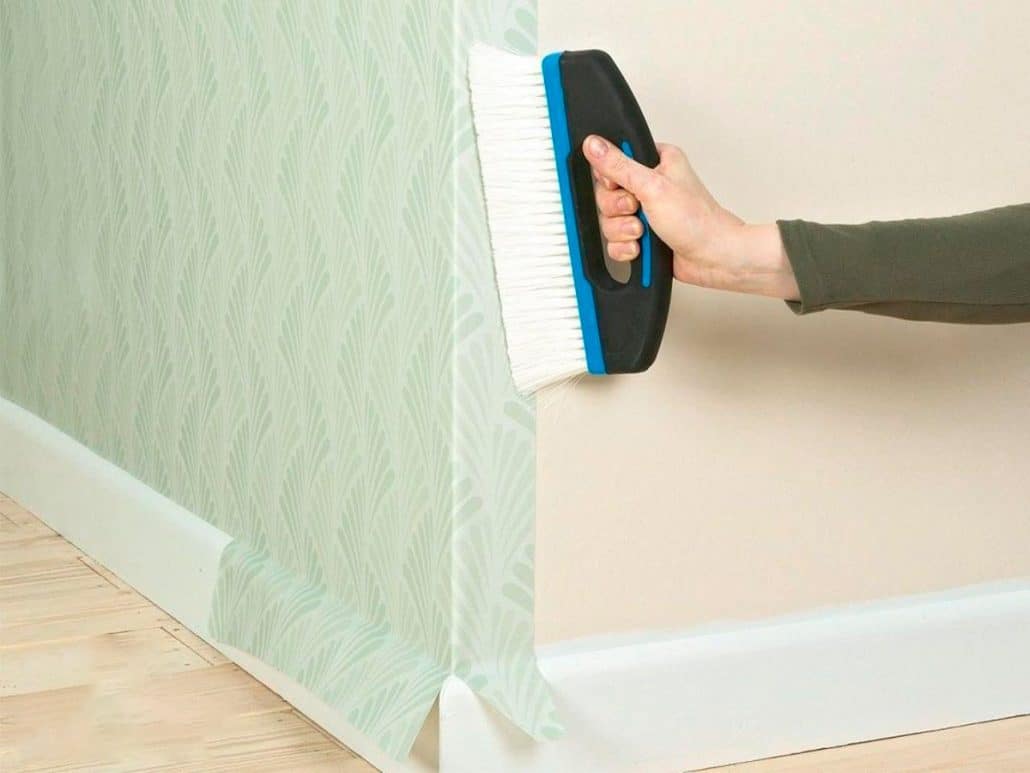 Когда работа проводится в труднодоступных местах и в угловых зонах, правила работы отличаются. Углы внешние и внутренние должны заклеиваться внахлест. Вырезается полоса, с запасом в 2-5 сантиметров, которые будут приклеиваться к смежной стене, следующая полоса наклеиваться сверху этого куска. После излишки аккуратно срезаются. Тщательно прокатывают валиком по данным участкам. Дверные и оконные проемы также проклеивают внахлест, с обрезанием полос по необходимым размерам.