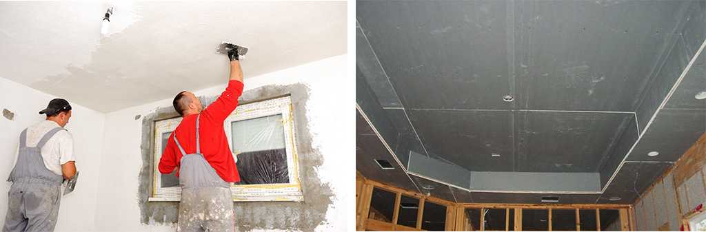 Слева – выравнивание шпаклёвкой по бетонной плите перекрытия, справа – выравнивание путём монтажа подвесного потолка из гипсокартонных листов.
