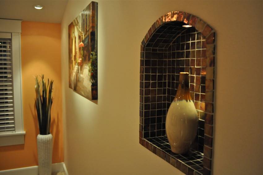 Углубление в стене станет альтернативой настенной картине или фреске, на плоскую поверхность можно поместить комнатные растения, свечи или стилизованный декор.