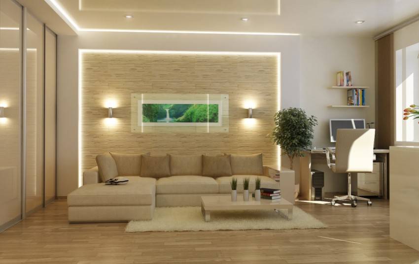 Удачное освещение станет украшением декоративного углубления в зале. Традиционно используют в качестве светильников точечные лампы или светодиодные ленты. Нередко их оснащают пультом для переключения режимов. С их помощью можно выбрать любой оттенок света или циклическое повторение разных цветов.