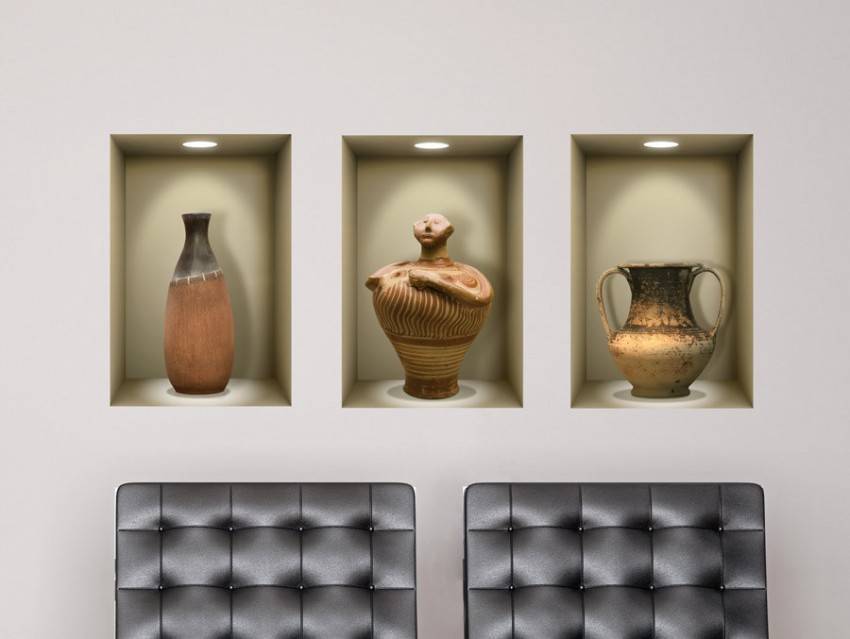 Один из вариантов – цветовые вариации декоративным материалом. Если в комнате используются светлые тона – обои или штукатурка, то стенку углублений можно оформить в более темных тонах. Например, использовать обои темного цвета, но узор или рисунок на которых будет похож на более светлые обои на стенах комнаты. Или же использовать те же обои или цвет штукатурки, что и для стен, но по краям углублений разместить декоративные облицовочные панели или молдинги, выполненные в темных цветах.