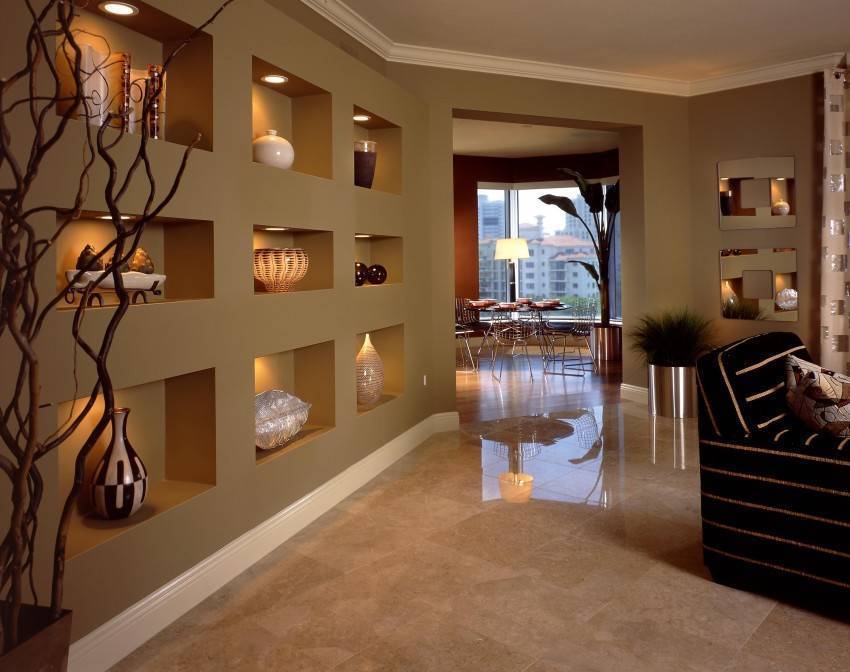 Углубление можно оформить в любом стиле, который, однако, соответствует общему дизайну помещения. Боковые края полости можно оклеить плинтусами из гипса, а красиво завершить отделку ниши в стене позволит декоративный венец. Полость в коридоре можно выложить керамической плиткой.