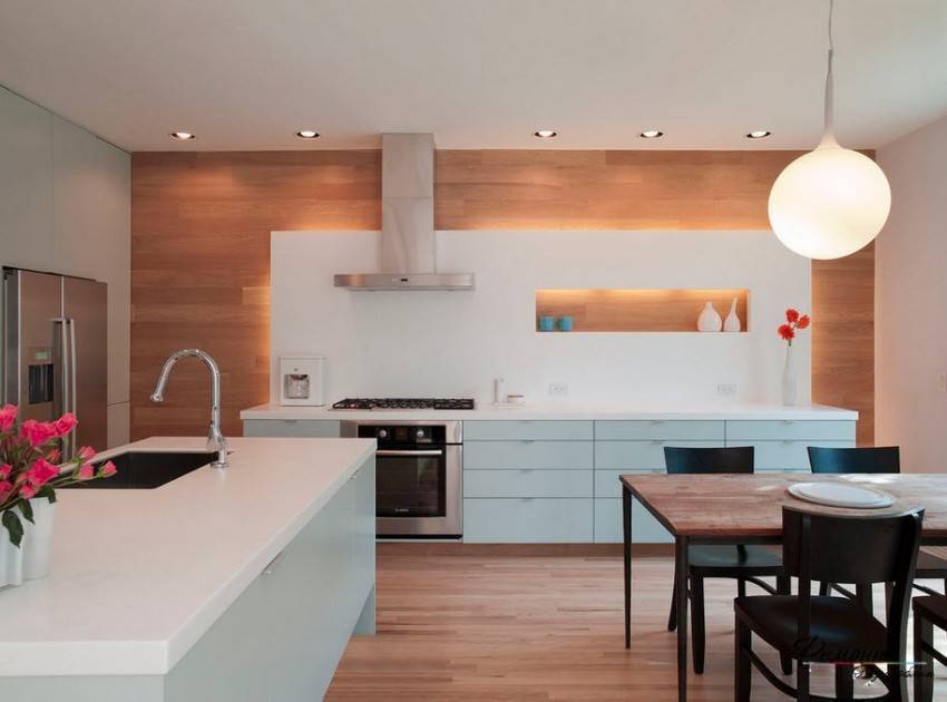 Красиво и компактно в углубление вписывается кухонная стенка.