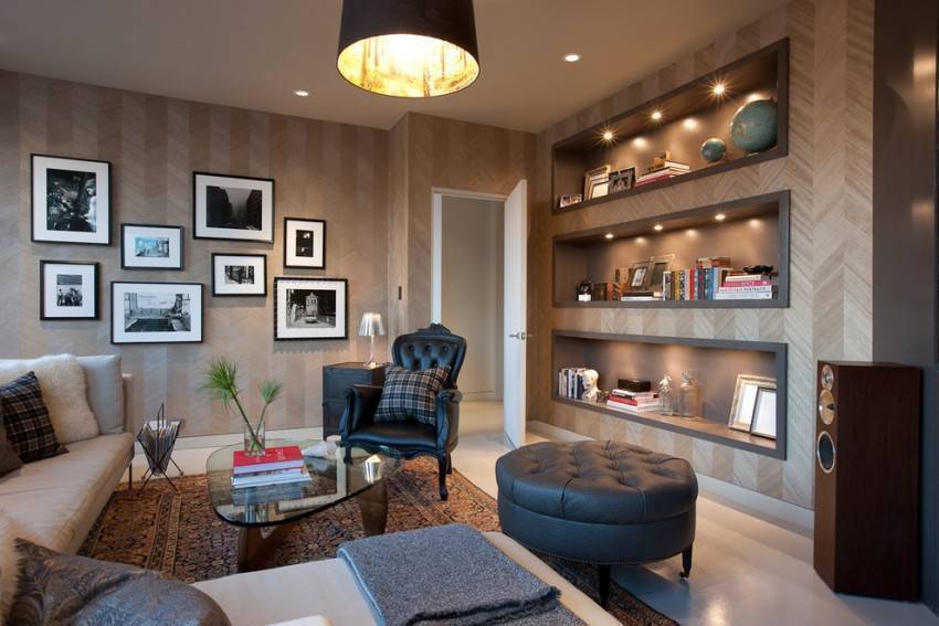 Неглубокие ниши в стене украсят интерьер гостиной, если придать им оригинальную форму и оборудовать подсветку. Поставить вазоны с цветами, декоративные свечи. На встроенные полки поместить семейные фото, сувениры и книги.