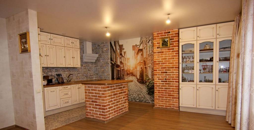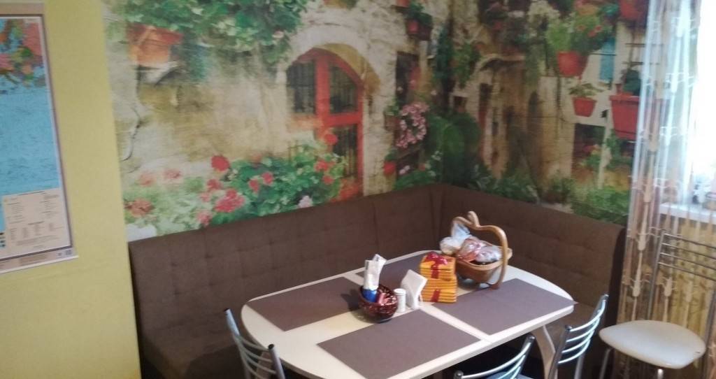 Поклейка фотообоев. Благодаря фотообоям можно зрительно увеличить площадь помещения, придать кухне современный дизайн.