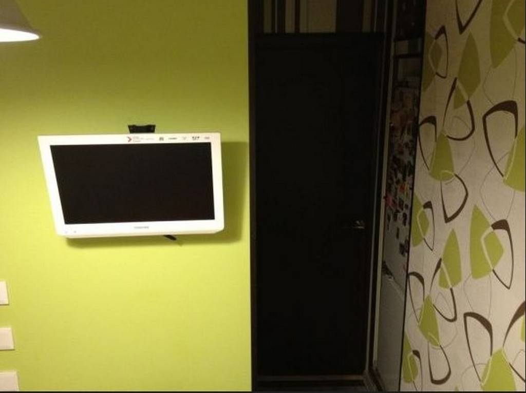 Необычное комбинирование фотообоев с простым материалом. Благодаря гиперреалистичности обойного полотна комната увеличивается в объеме, а также наполняется романтикой утреннего леса. Вторые обои также грамотно подобраны, они имеют приятный однотонный фисташковый цвет, который гармонирует с «лесом», а также не «ломает» гостиную на отдельные помещения.