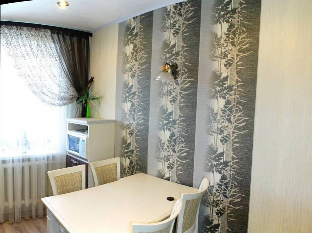 Для тех, кто не планирует удлинять комнату по высоте, подойдет горизонтальный способ поклейки. Реализуя горизонтальное комбинирование покрытий двух цветов, вы сможете подчеркнуть старинный или современный стиль, создать дополнительную защиту от загрязнений (например, в зоне обеденного стола) и обеспечить гармоничное сочетание дизайна стен с кухонным гарнитуром.
