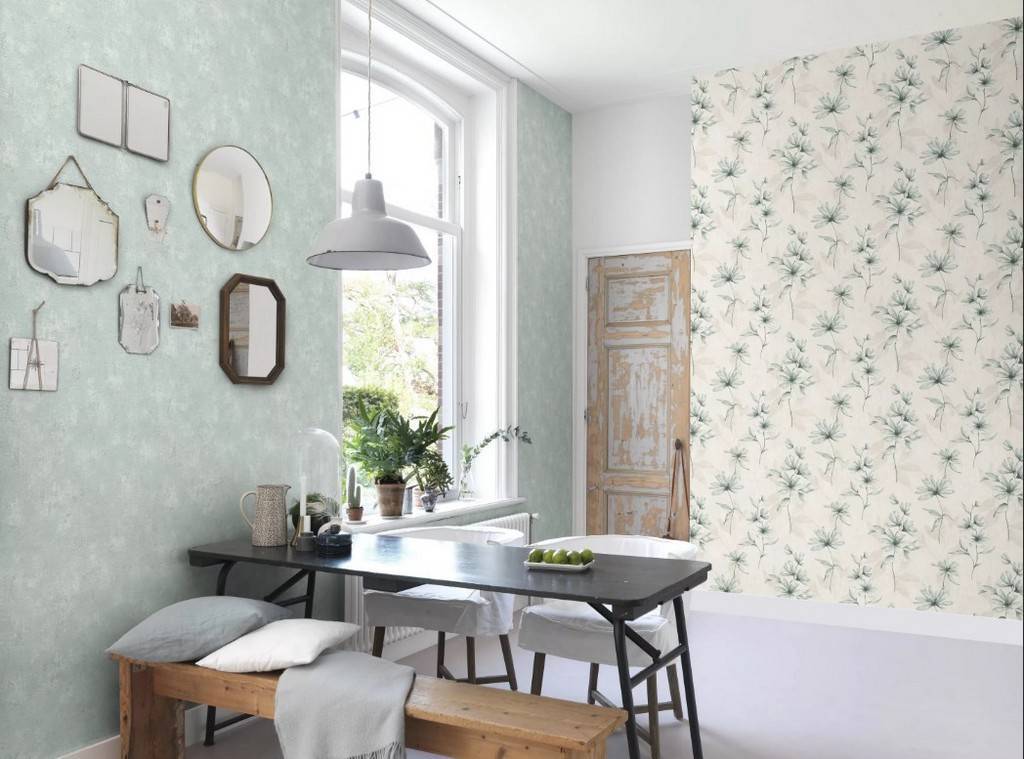 Еще немного флористики. На фото ниже живые цветы на обеденном столе кухни, обои с флористическим мотивом и однотонные салатовые прекрасно гармонируют между собой.