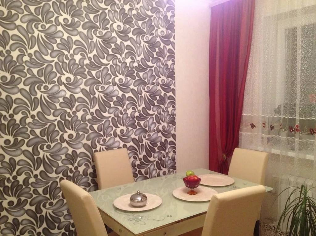 Чаще всего элемент с рисунком размещается в непосредственной близости от обеденного стола. Если цвет на фоне будет перекликаться с парой, получается настолько гармоничная пара, что порой кажется, что это обои не двух видов, а одни и те же.