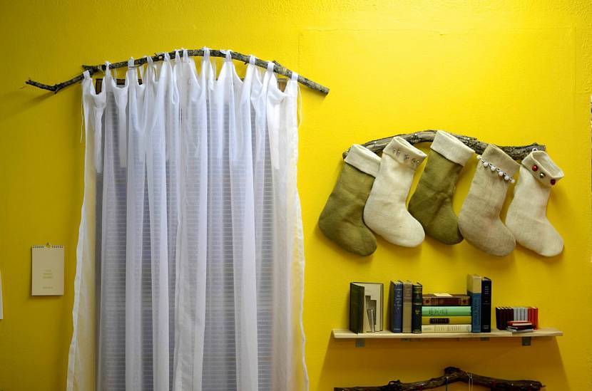 - Красивая ветка дерева. Нужно отыскать гибкую, но упругую ветку с небольшой кроной. Предварительно ее подготавливают (окрашивают, вскрывают лаком). Затем закрепляют на стене, как обычный карниз. Для такого карниза подойдут занавески на крупных кольцах, петлях и люверсах.