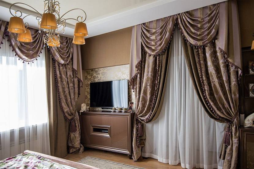Ламбрекены с драпировками уместны в центральной комнате, они создадут атмосферу уюта и роскоши в сочетании с другими предметами интерьера.