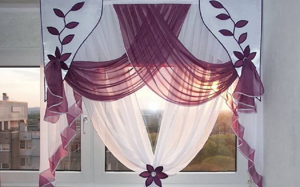 Вешают преимущественно на настенные гардины с прочным каркасом. Предусматривают выполнение подхватов и декорирование их розами, вышитыми из лент. Для ночных штор выбираются более плотные материалы: шелк, лен, габардин. Если используют еще и тонкую занавеску, тогда отдают предпочтение легким материям: вуаль, органза. Когда окно в комнате большое, тогда шьют шторы с верхним ламбрекеном, разделенным на небольшие подхваты, дополненным декором.