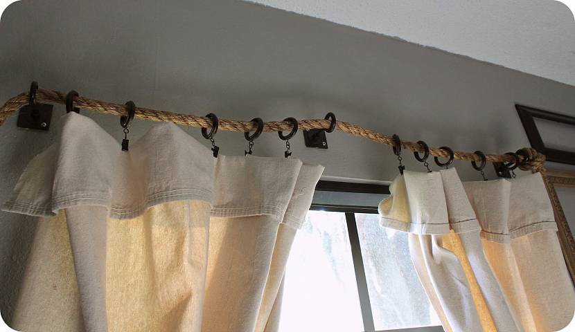 - Используя толстый канат. Для этого потребуется установить в стену над окном три крепления-кронштейна. Через них продеть канат. На него вешаются занавески на люверсах.