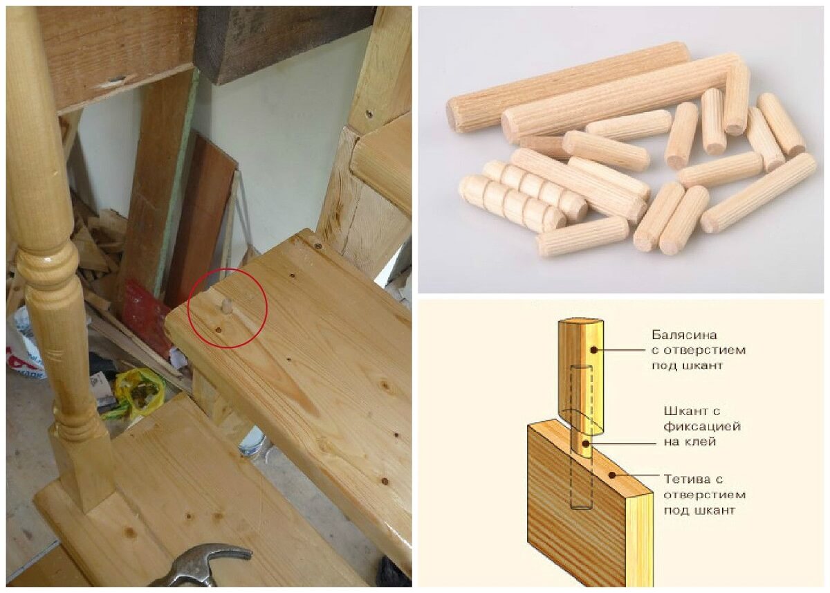Для закрепления элементов на ступени или тетиве, необходимо разметить точки установки, которые должны располагаться на одной линии. В местах разметки просверливают углубления для шкантов. Выступающий торец последних следует тщательно промазать клеем, а затем вставить их в полученное углубление.