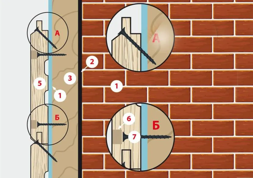 За то время пока идет адаптация дерева, монтируют обрешетку. Лучше всего для нее выбрать деревянный брусок толщиной 40-50 мм. Ширина должна быть не меньше, а желательно даже больше — 60 или 70 мм. Брусок обрабатывают антисептиком. Если это отделка деревянного дома, то обрешетку крепят саморезами по дереву. Если стены из бетона, кирпича или строительных блоков, то крепление обрешетки проводят соответствующими видами дюбелей. Например, для полнотелых блоков — забивными анкерами, для пустотелых — анкерами «бабочкой».
