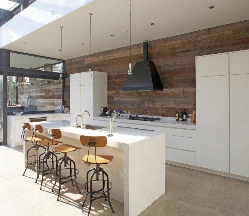 На кухне ламинатом чаще всего отделывают фартук над кухонным гарнитуром. Цвет подбирают таким образом, чтобы он обязательно гармонировал с фасадами мебели. Такой фартук практически ничем не уступает керамической настенной плитке по эксплуатационным качествам. При этом он гораздо дешевле и удобнее в монтаже. Очень легко осуществлять уход за санитарным состоянием зоны приготовления пищи, если на кухне произведена отделка стен ламинатом. Фото таких решений поражают чистотой и ухоженностью самого подверженного загрязнениям пространства в доме.