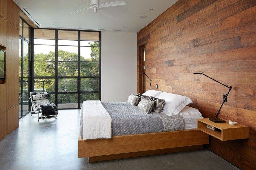 Очень превосходно в этой комнате выглядит ламинат на стене в интерьере. Фото самых интересных вариантов говорят о том, что в спальне принято отделывать поверхность стены, которая расположена за изголовьем большой кровати. Панели подбирают в точном соответствии со цветом мебели. В результате создается впечатление единого гарнитура. На отделанной ламинатом стене можно тоже закрепить различные полочки и аксессуары, которые придают уют и вселяют жизнь в любой интерьер.