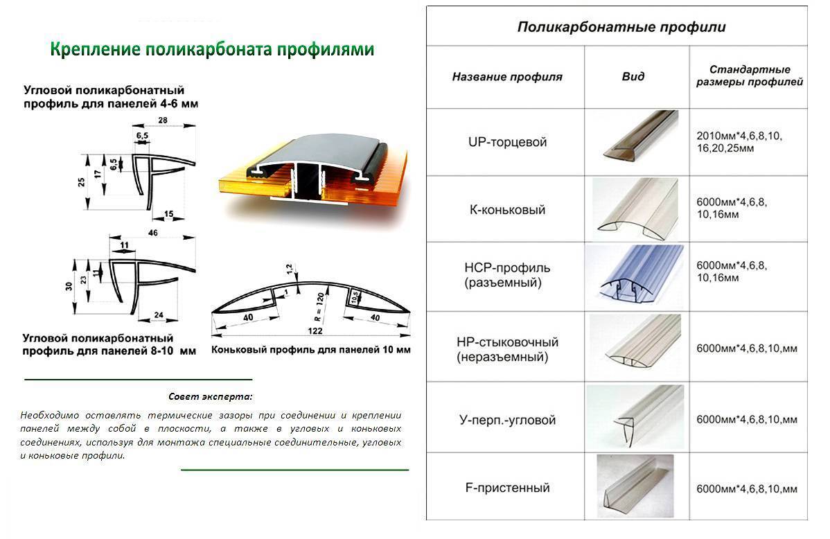 Для того, чтобы соединить поликарбонатные панели между собой и прикрепить их к каркасу, обеспечить герметичность, устойчивость и длительный срок службы деревянных теплиц с покрытием из поликарбоната, кроме указанных инструментов необходимо также наличие дополнительных профилирующих элементов различного назначения (они могут поставляться в комплекте к поликарбонатным листам, а также их возможно приобрести отдельно в специализированных магазинах):