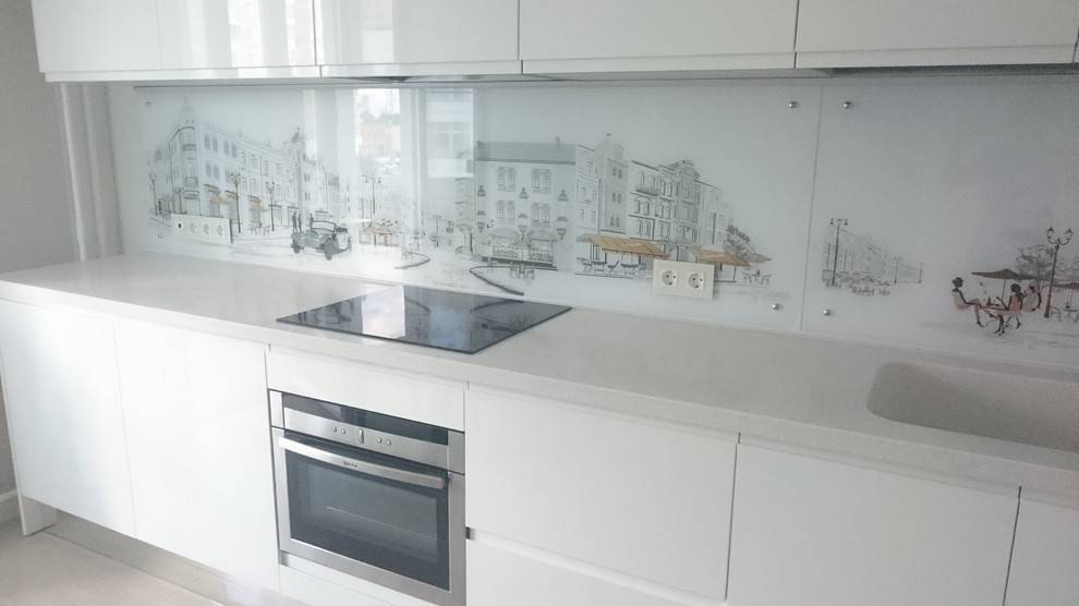 Такой вариант подходит ценителям нестандартных решений. В кухонной зоне появится настоящая картина, полотно, которое станет ярким акцентом. Можно выбрать панели с растительным орнаментом, панорамой мегаполисов, натюрмортом, живописным пейзажем горной местности или один из сотен тысяч других вариантов. Прочитайте как подобрать фартук для белой кухни с черной столешницей в этом материале.