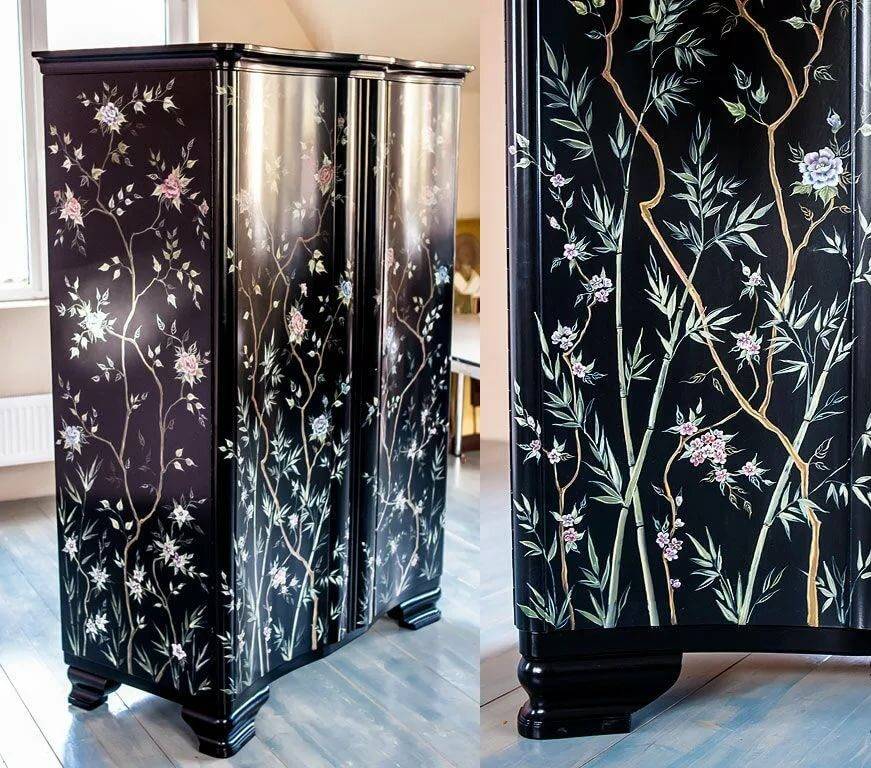 Чтобы устаревший шифоньер вписался в обновленный дизайн комнаты, добавьте витиеватые узоры из цветов. Необычный геометрический орнамент, созданный с помощью плёнки-самоклейки, вдохнет в старомодную мебель новую жизнь.