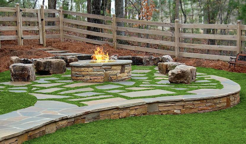 Очаг, собранный из необработанных речных булыжников удачно вписывается в концепцию натургардена. Вместо кресел вокруг такого объекта лучше расставить живописные валуны большого размера или деревянные пни.