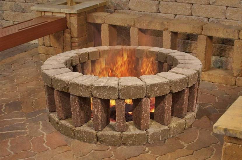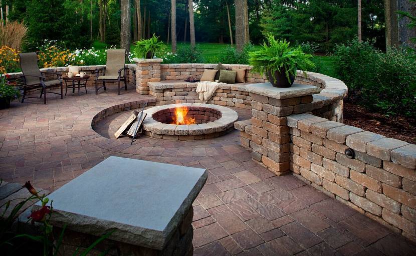 Чаша из кирпича будет органично смотреться, если из такого же материала собран забор, установленный по периметру придомовой территории. Кирпич лучше использовать для сборки кострища закрытого типа. Выбирая узорную кладку, несложно усиливать декоративный эффект практичного элемента ландшафтного дизайна.