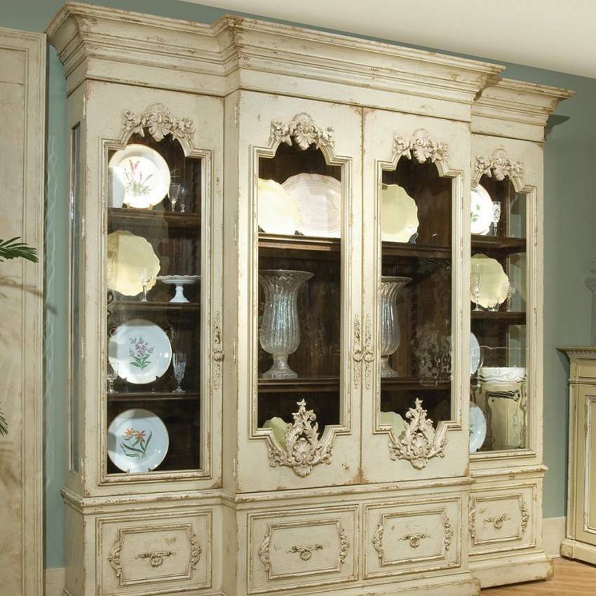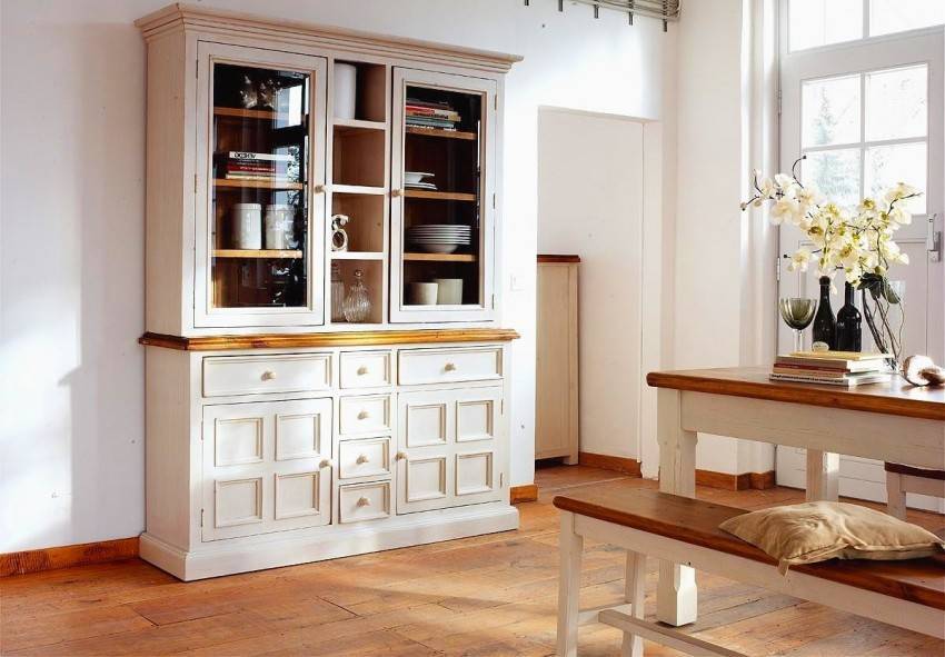 Вместительный буфет — гордость советских семей — можно сделать акцентом кухни-гостиной, если вы оформляете интерьер в стиле классика или прованс. Для этого громоздкий темный гарнитур нужно окрасить в однотонный нежный цвет (характерный для французского провинциального пейзажа), кружевным узором или в классический бронзовый оттенок.