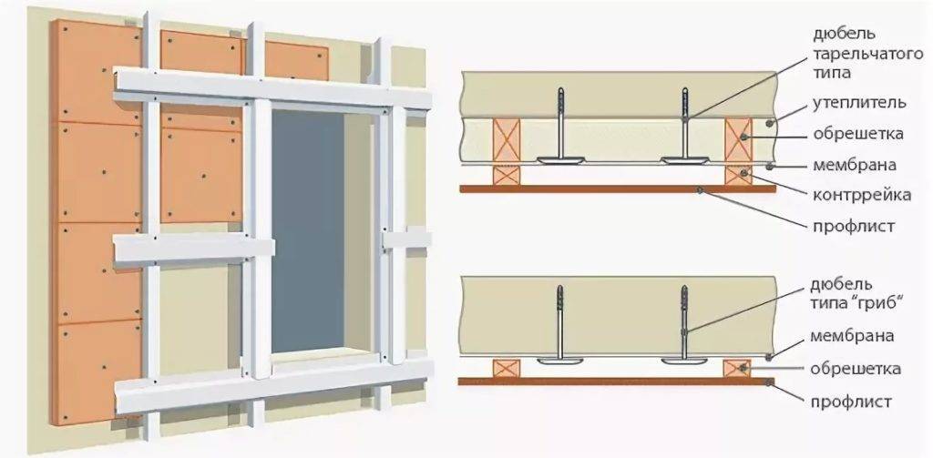 Профиль из дерева или алюминия устанавливается в вертикальном положении с разбегом от 10 и до 50 см. По толщине обрешетка идентична толщине утеплителя.