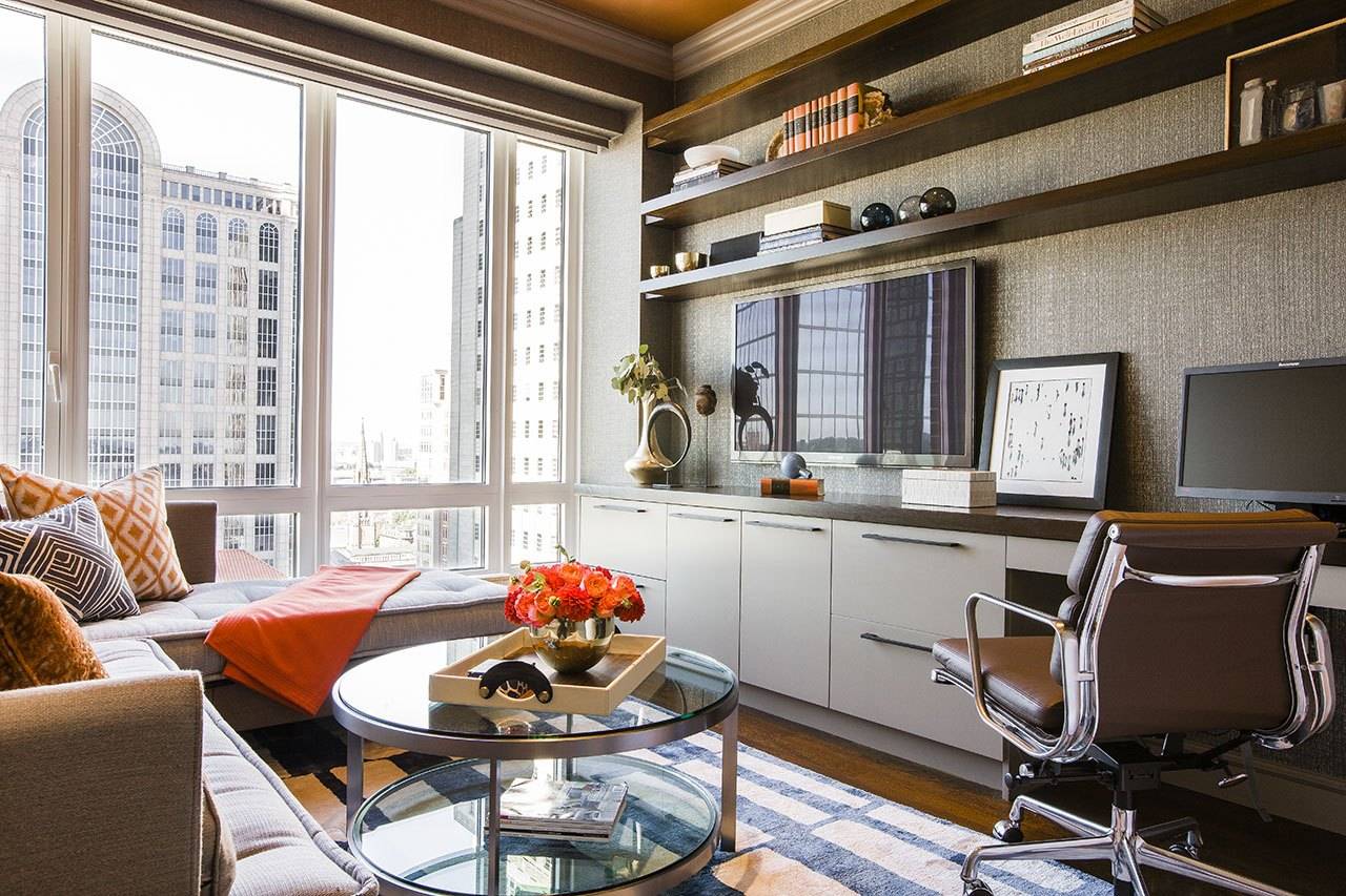 Для обустройства кабинета не требуется много площади. Данную зону можно дополнить, как готовым фабричным столом, так и столешницей, выполненной на заказ. Большое количество окон всегда предоставляет качественное естественное освещение для комфортной работы.