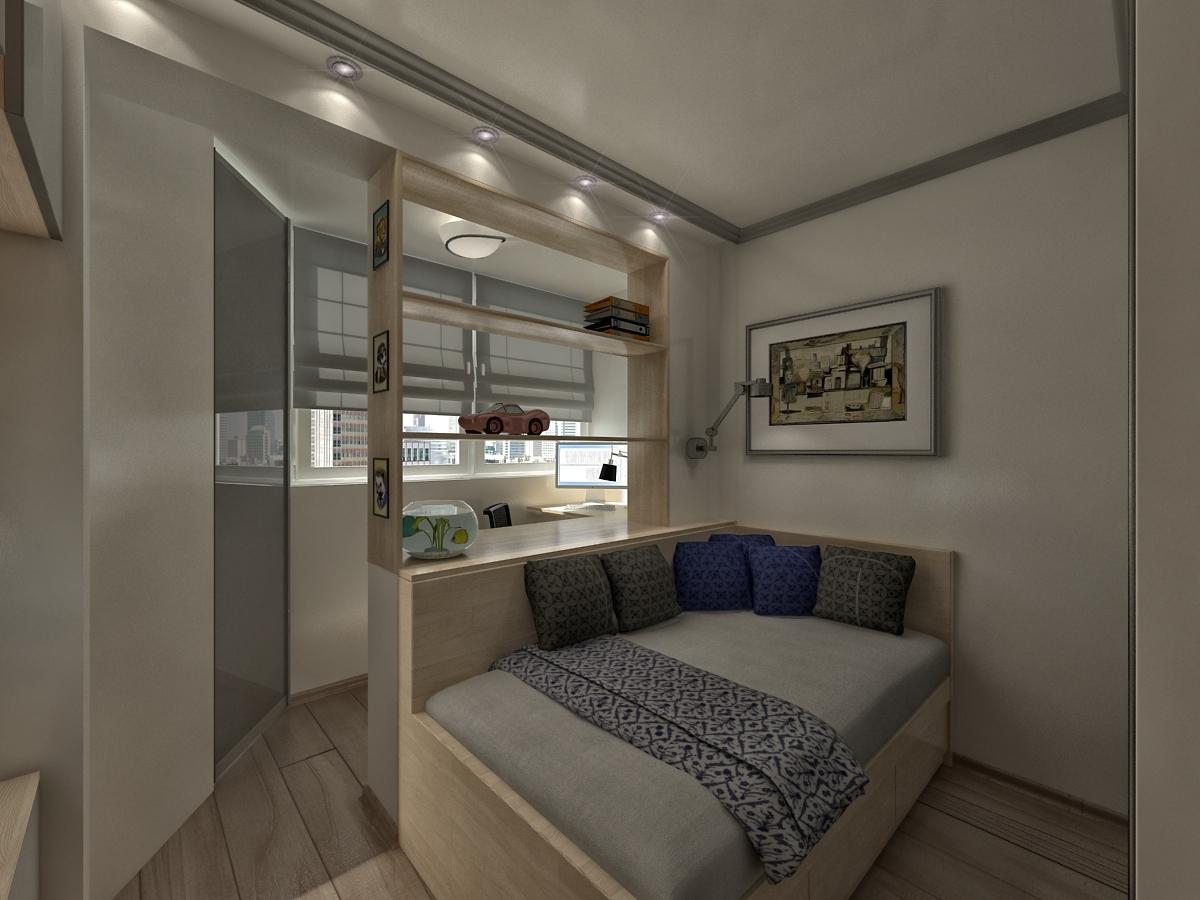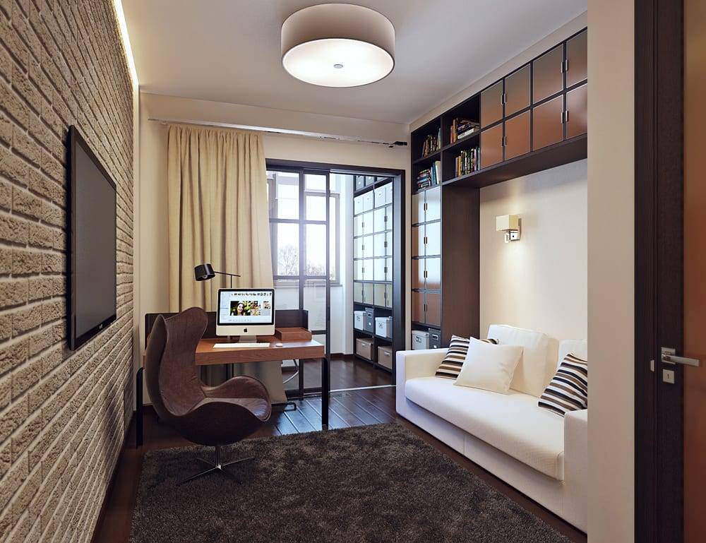 В малогабаритных квартирах иногда не только кабинет негде организовать — даже с отдельным спальным местом могут возникать проблемы. Если есть у вас балкон, пусть даже 3 квадрата по площади, его можно превратить в небольшую спальню. А если площадь 6 квадратов и больше, то с другой стороны можно еще и рабочий уголок устроить.