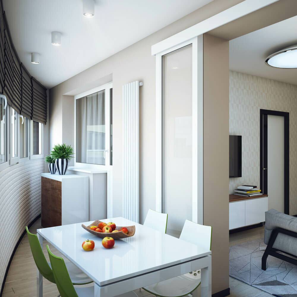Организация обеденной зоны на балконной площади является идеальным вариантом в дизайне малометражных квартир. Подобная перепланировка позволяет добавить рабочей зоне на кухне, простора и свободы. Функциональным минимумом столовой считается аккуратный стол, несколько стульев или кресел.