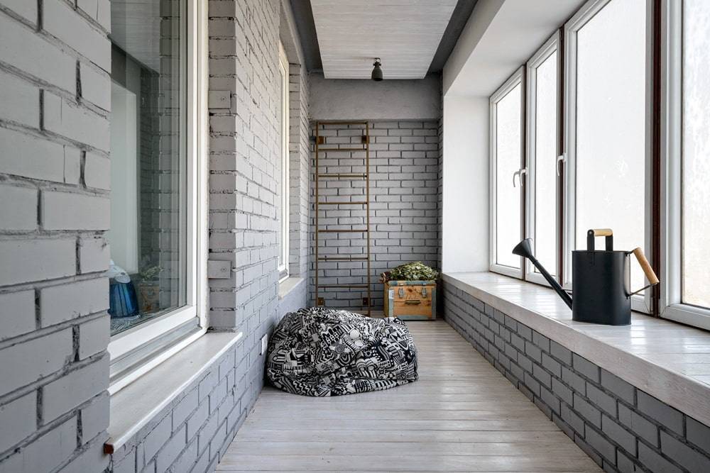На фото стены в дизайне балкона, выложенные кирпичом серого цвета.