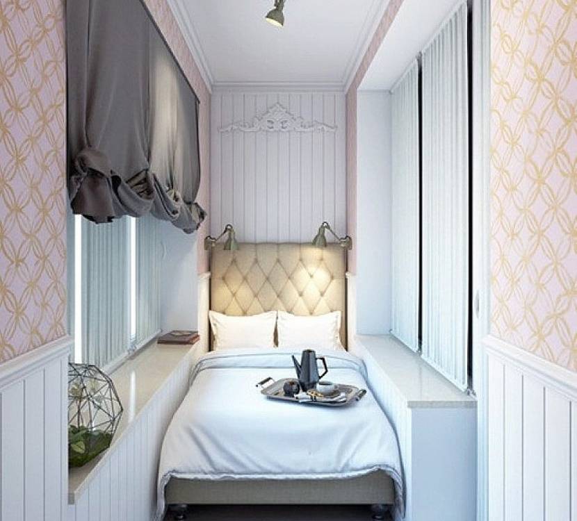 Дизайн лоджии, фото помещения площадью 8 метров, оборудованного в уютную спальню