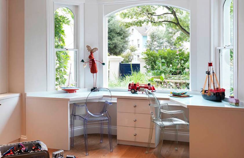 Использовать такую удачную идею, как стол-подоконник можно с равным успехом для одного или двух-трех детей. Главное, чтобы хватило ширины простенка. Делать отдельные секции не обязательно, достаточно обеспечить каждому ребенку собственное посадочное место.