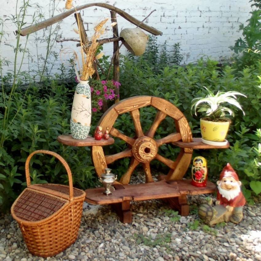 Из дерева мастерят различные декоративные тележки, оснащая их колесами от старых велосипедов. Из деревянных спилов многие дачники делают садовые дорожки и сооружают многоярусные клумбы.