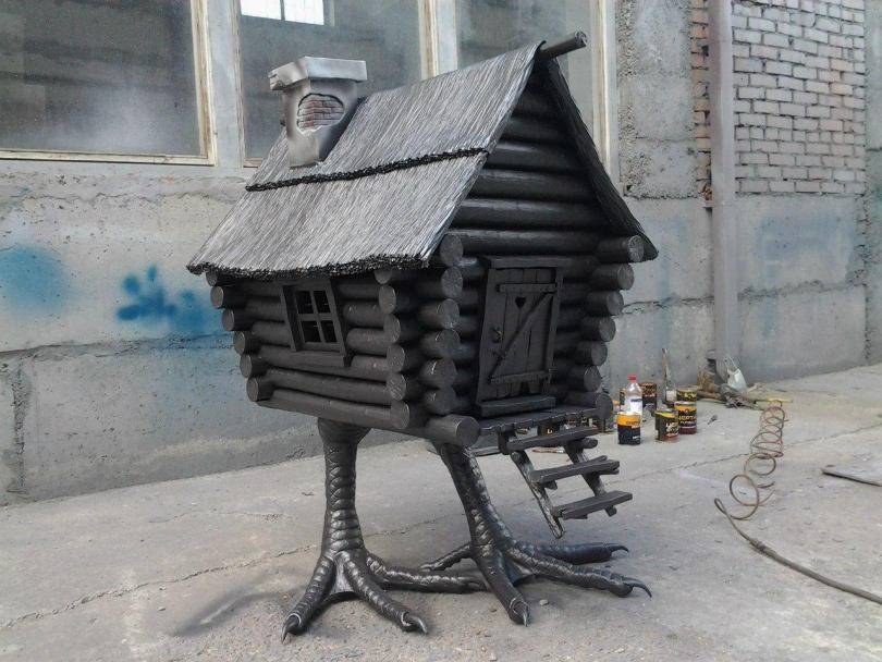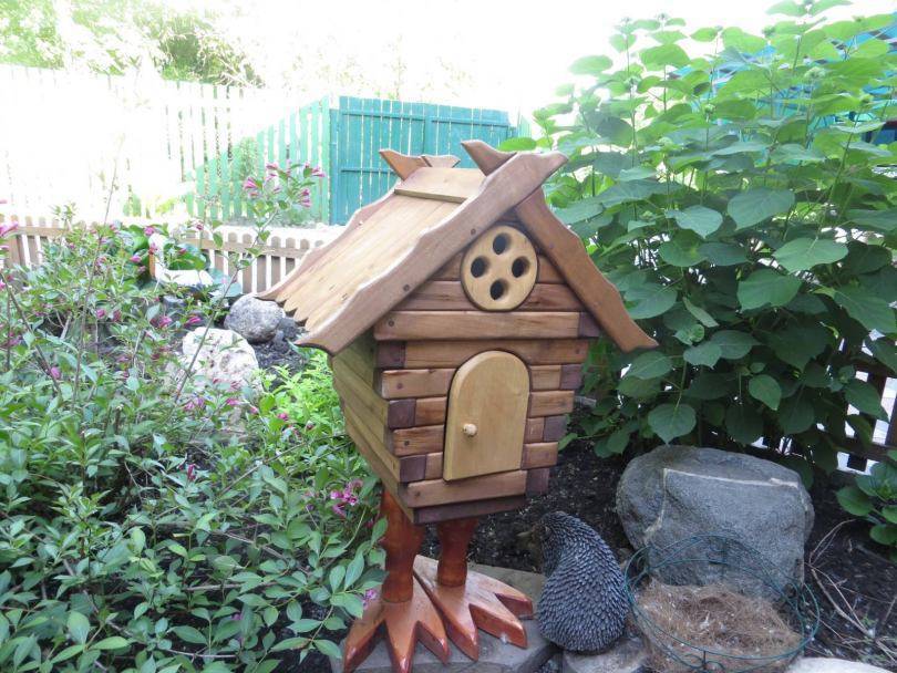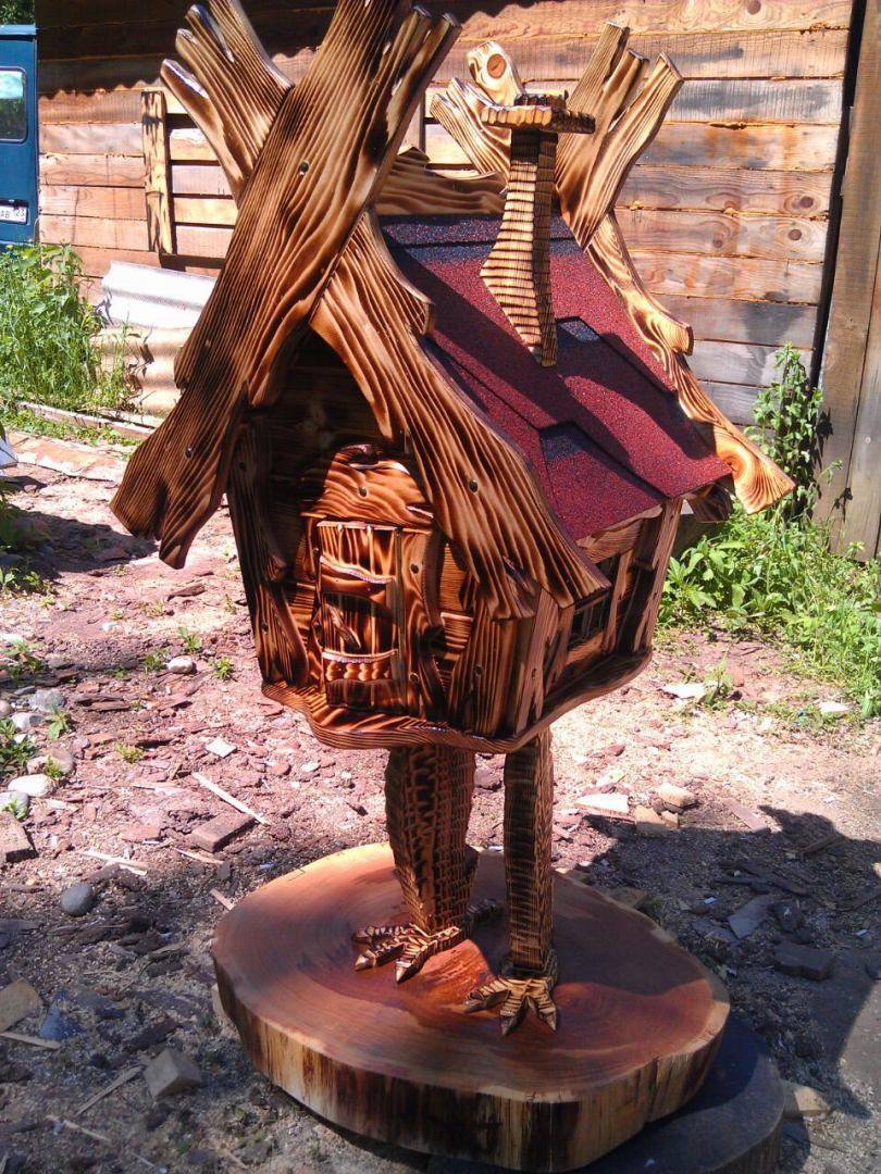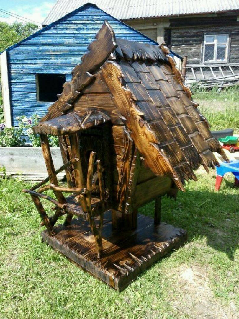 Очень необычно смотрятся различные деревянные домики для детей. Их можно прикрепить к стволу большого дерева, а можно сделать миниатюрным строениям опоры в виде куриных ножек.
