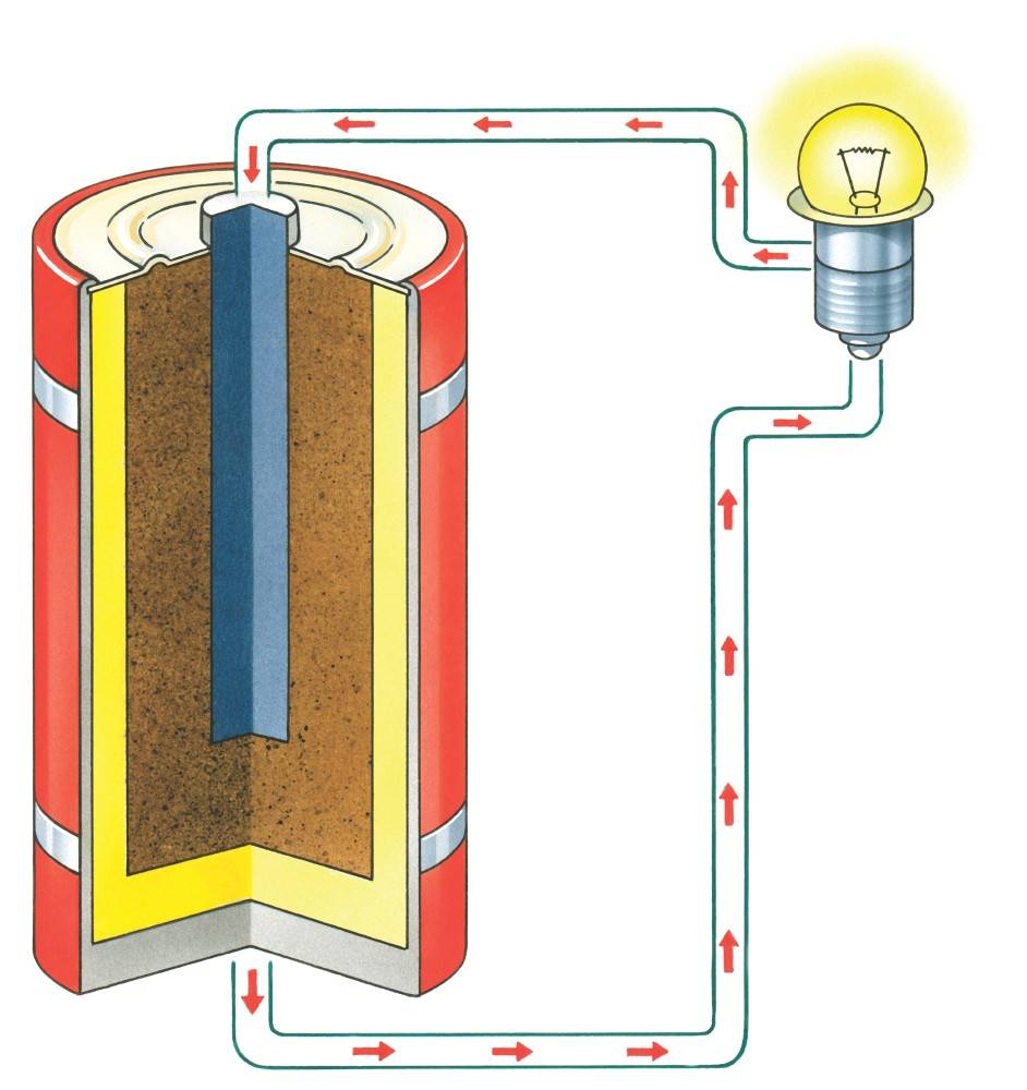 Обратите внимание на рисунок строения гальванического источника тока. Стрелки (вверху) указывают направление движения электронов, однако направлением тока условно принято считать перемещение от плюса к минусу