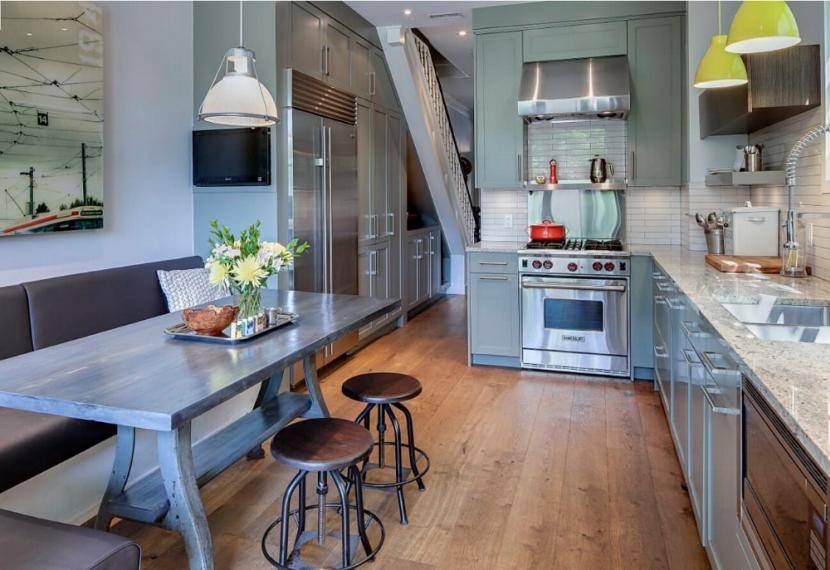 Например, выдвигающиеся из шкафа полки, которые похожи на стулья и стол. Конечно, ножек или каких-либо дополнительных подставок у них не имеется, но также отсутствуют и углубления. Они плоские, так что отлично подойдут для разделки мяса, а иногда могут заменить собой рабочую зону. Еще одно интересное решение – кухня, проходящая вдоль одной стены. Такой вариант сложен в исполнении, но довольно удобен.