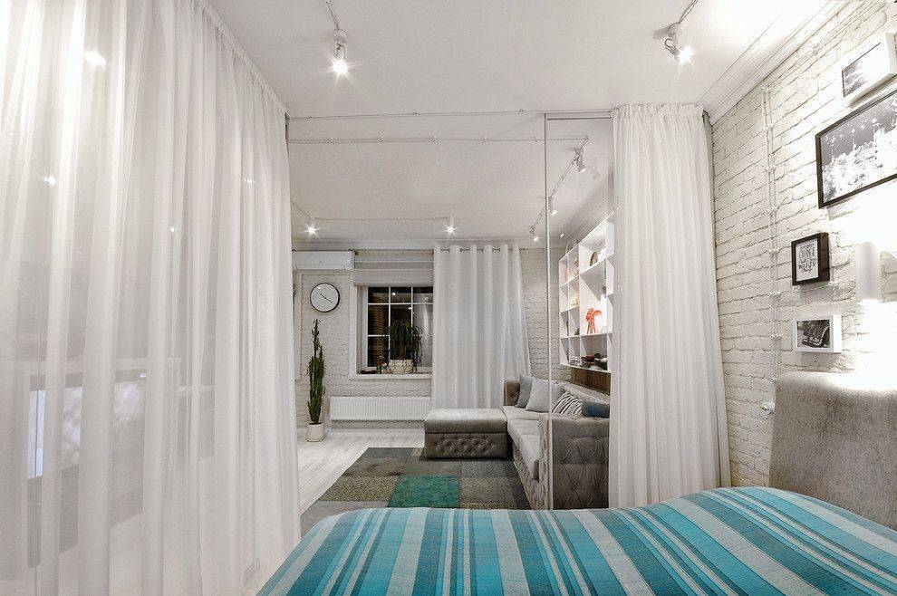 Самый простой и удобный вариант зонирования – деление шторами или занавесками. Их можно сменить, а также убрать в любое время. Если поместить шторы вокруг кровати, то получится изолированная зона для сна.