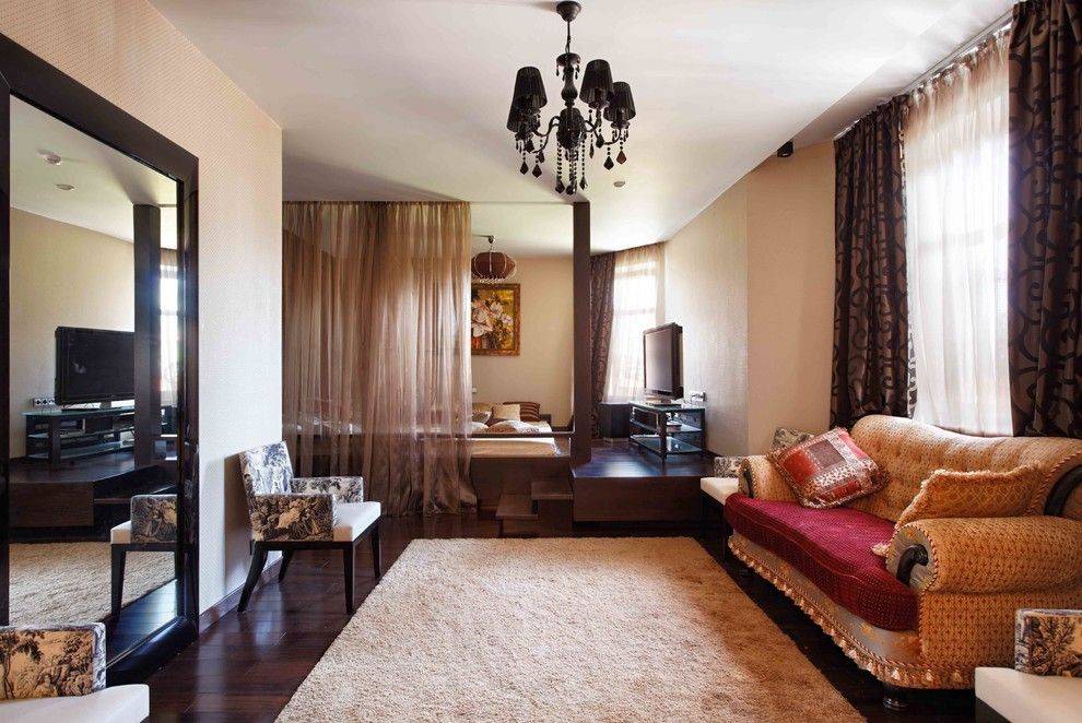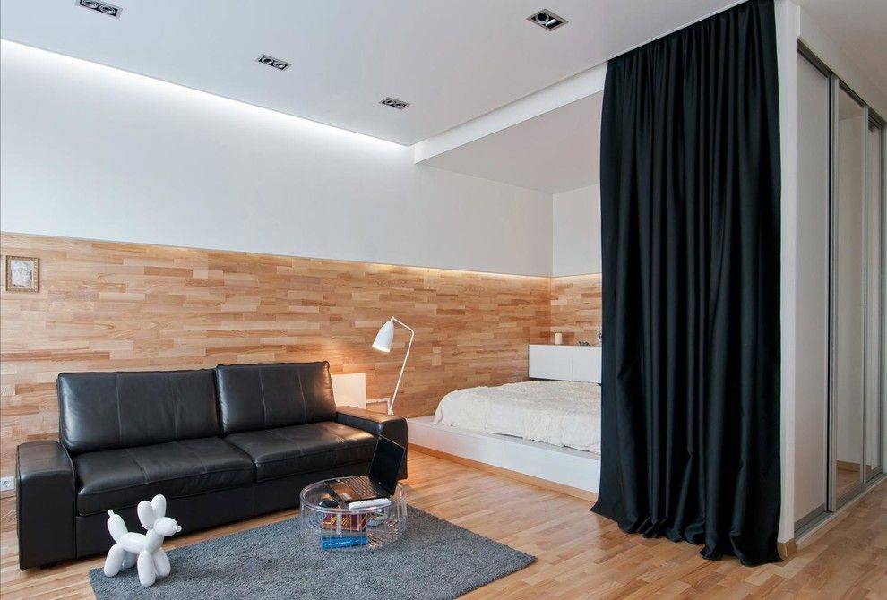 Итак, рассмотрим самые разные варианты деления комнаты на две зоны: спальню и гостиную.
