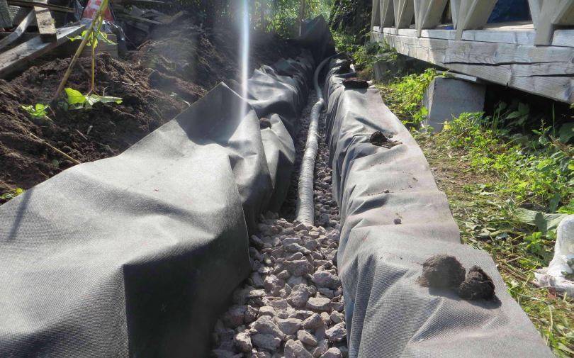 А чтобы отверстия не загрязнялись, оберните трубы геотекстилем. Завершив укладку труб, до верха засыпьте траншею песком и щебнем. Главное, обустроить все так, чтобы сами трубы не контактировали с грунтом.