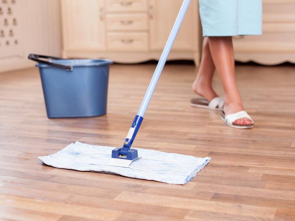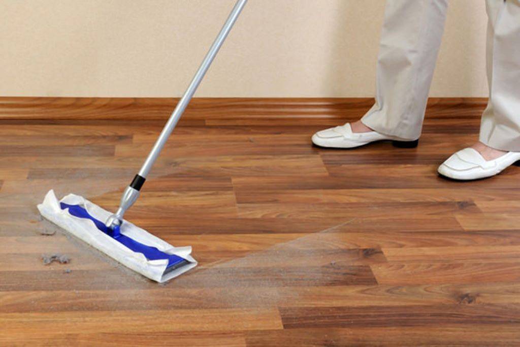 - Если планируется произвести влажную уборку, необходимо сначала очистить поверхность от пыли, песка и мелкого мусора — это можно сделать с помощью веника, специальной щетки-швабры или же пылесоса. Это исключит повреждение покрытия частицами грязи, которые обладают абразивными свойствами.