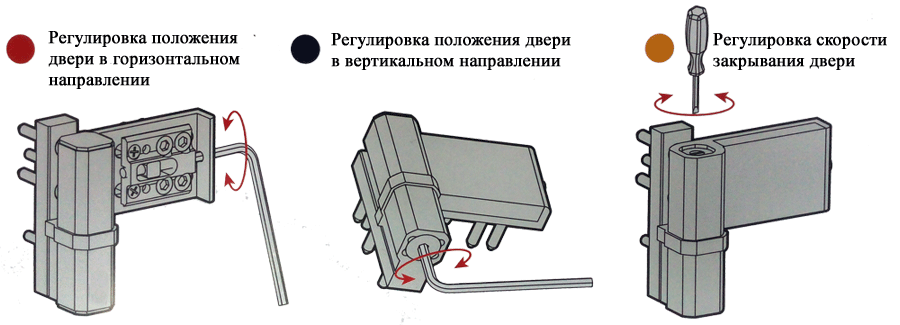 Чтобы увеличить плотность прижима двери со стороны петель, необходимо отрегулировать третий винт петли.