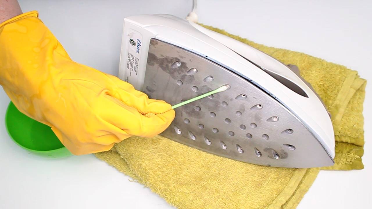 При чистке парового утюга активировать опцию выброса пара, а затем обработать отверстия сухой ватной палочкой.