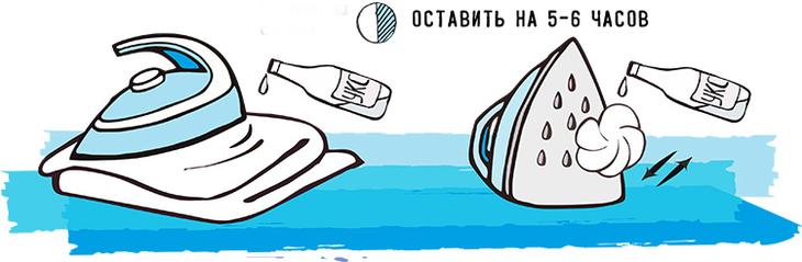 Схема такой чистки утюга от нагара в домашних условиях одинакова: следует обработать горячую подошву тканью, смоченной в жидкости. При въевшемся загрязнении можно оставить холодный утюг на всю ночь на пропитанном раствором лоскуте, а утром протереть его сухой материей.